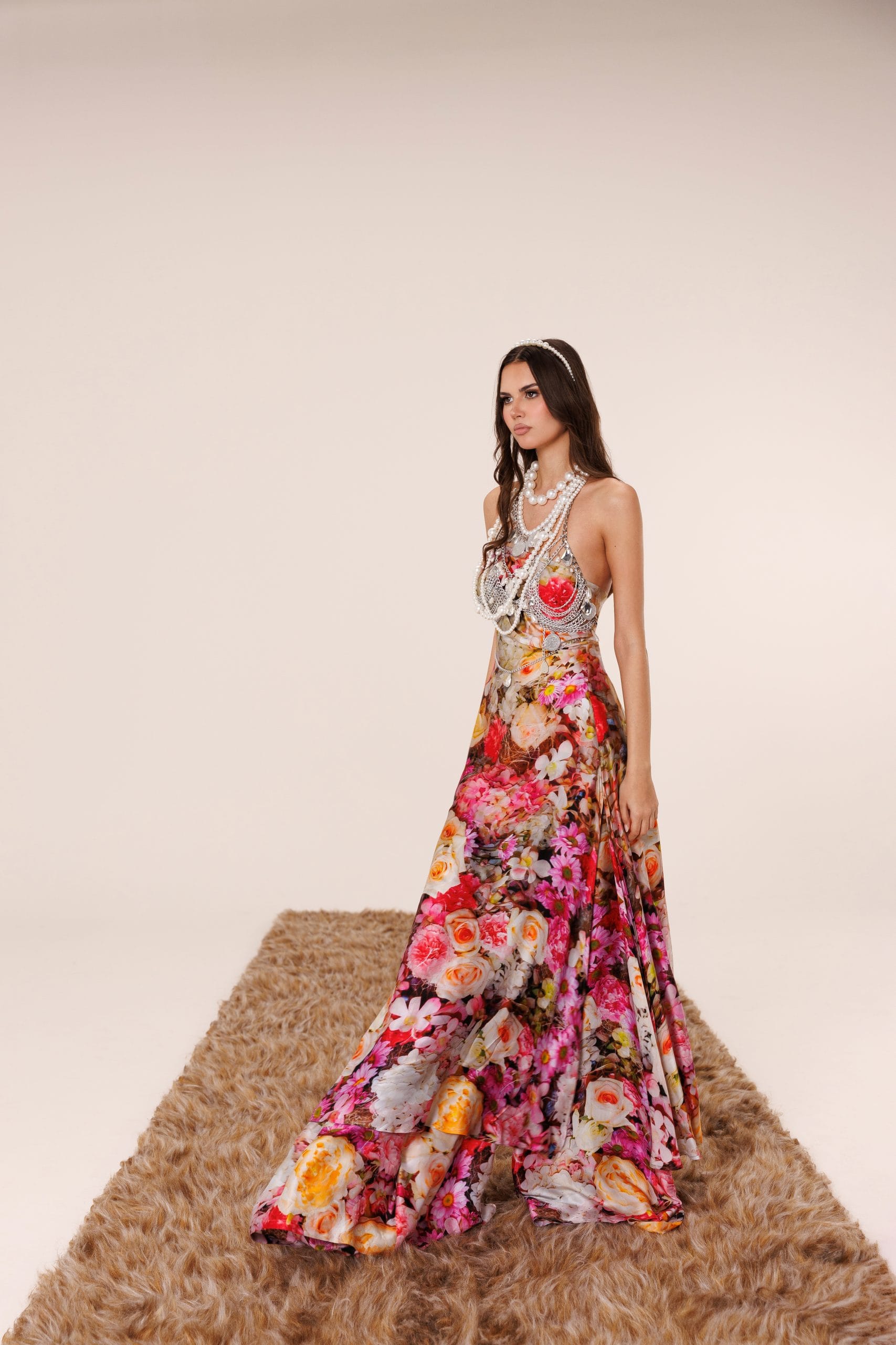 Canlı floral desenler, doğanın büyüleyici katmanlarını yansıtırken; gövdeyi saran form ve aşağı doğru açılan silüet kusursuz bir denge yaratır.
