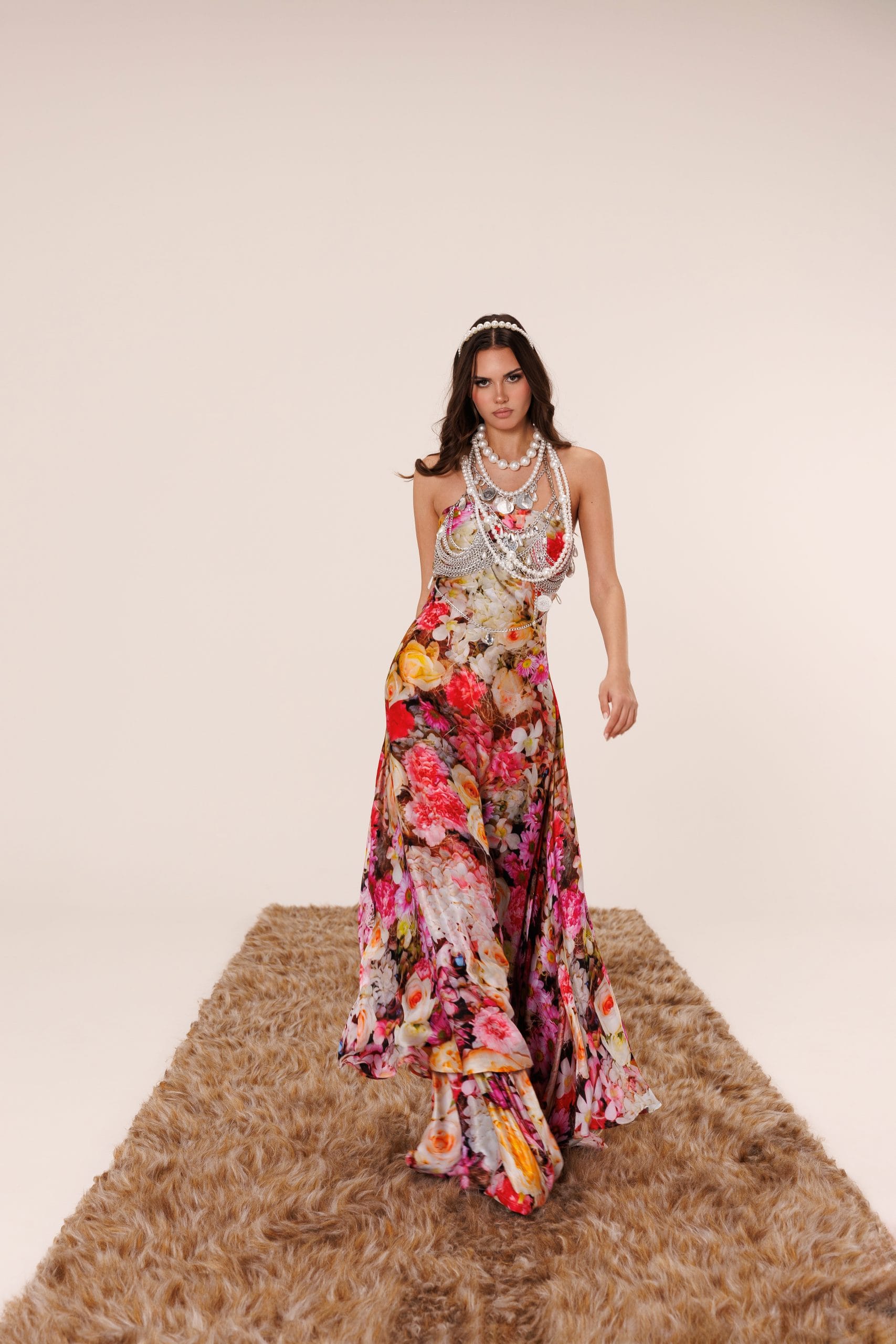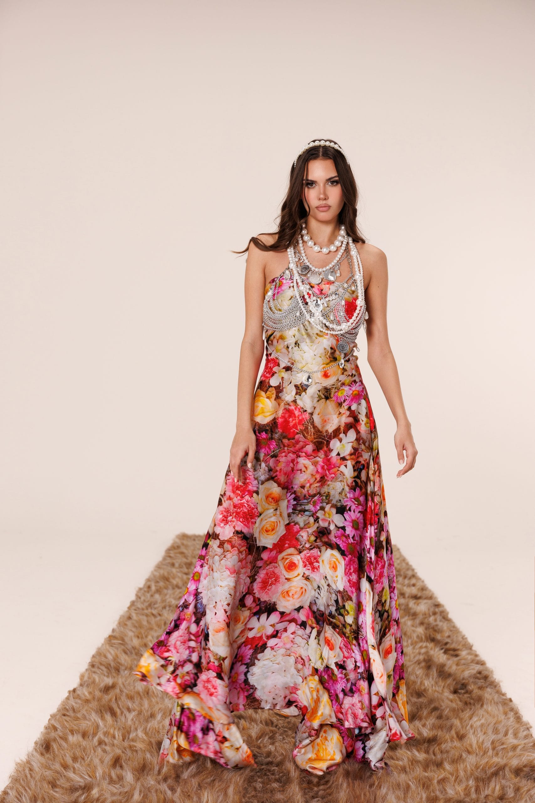 Eden %100 saf Mulberry ipek elbise ile couture zarafeti keşfedin. İnci detaylı üst tasarımı ve akışkan floral yapısıyla benzersiz bir lüks stil sunar.