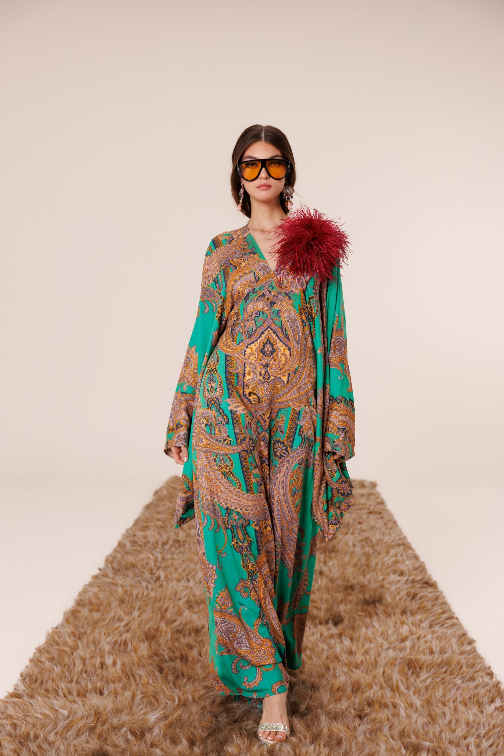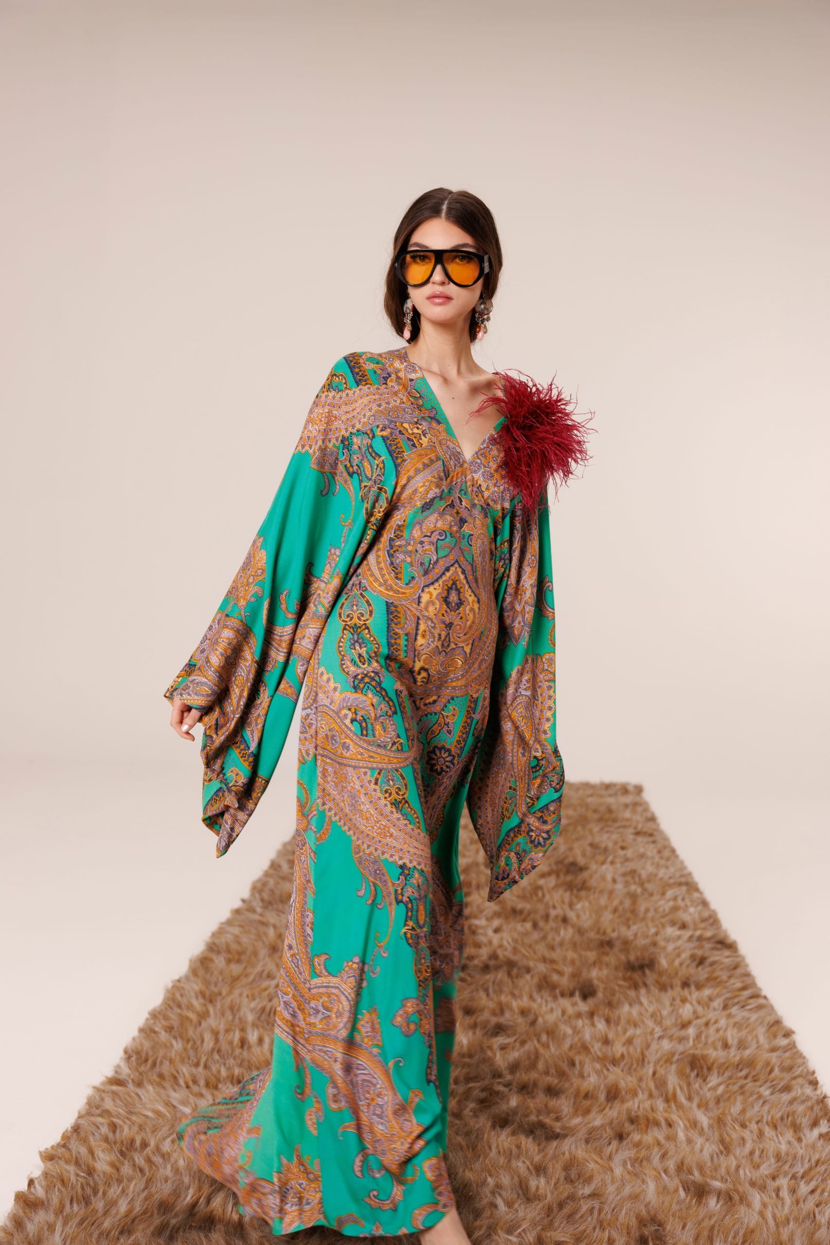 Zümrüt yeşilinin güçlü ve sofistike tonu, detaylı şal desenlerle birleşerek göz alıcı bir kompozisyon yaratır.