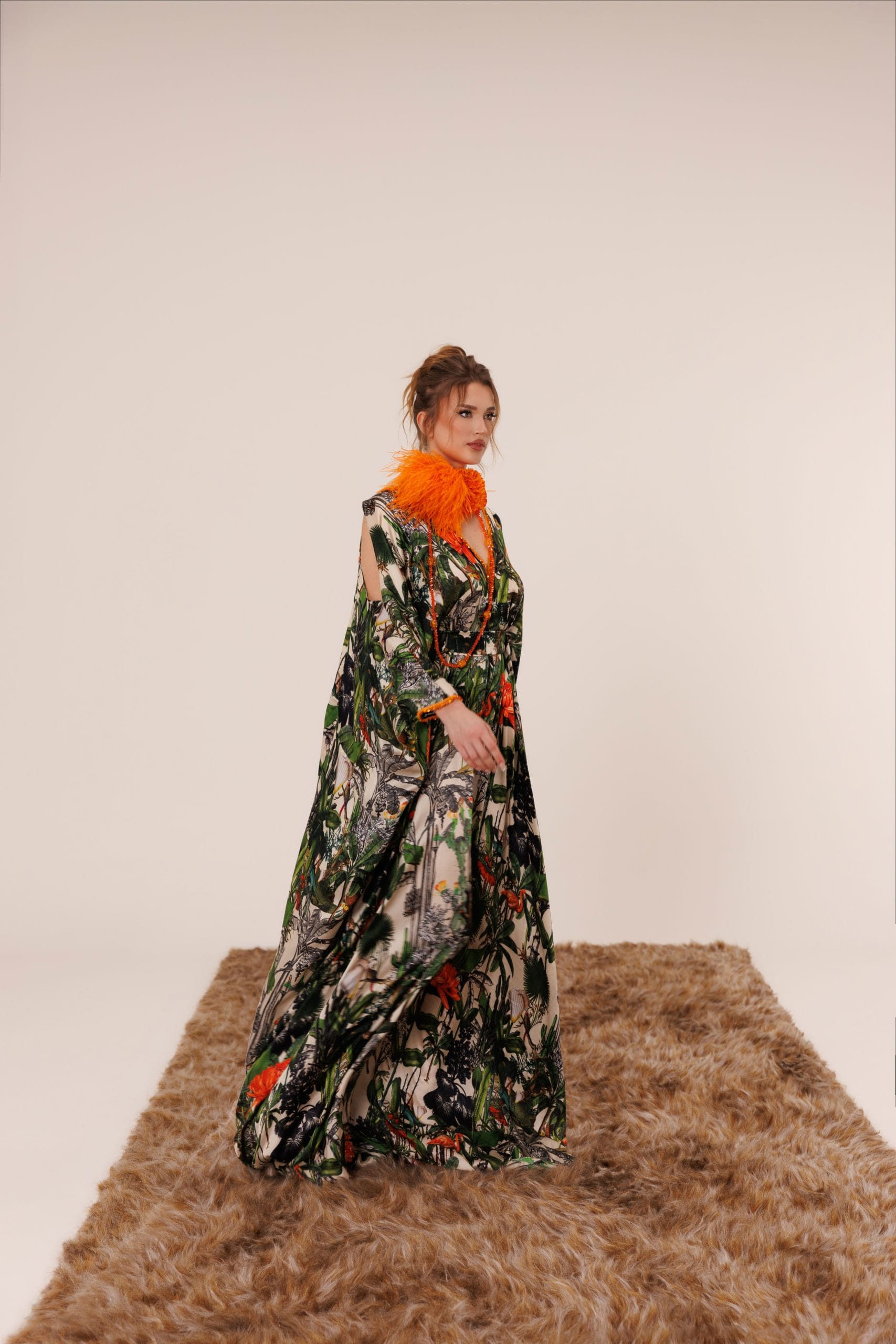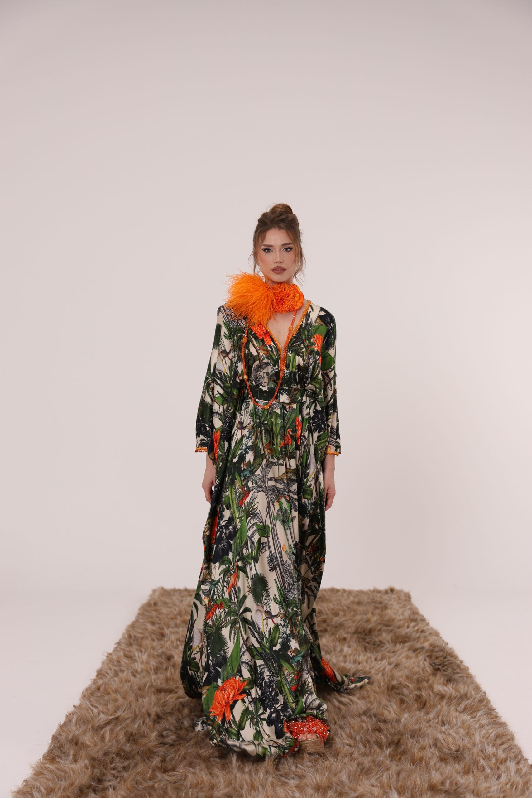 Flamingo %100 saf ipek elbise ile egzotik ve lüks bir stil keşfedin. Tropikal desenleri, akışkan yapısı ve kaftan formuyla couture bir görünüm sunar.