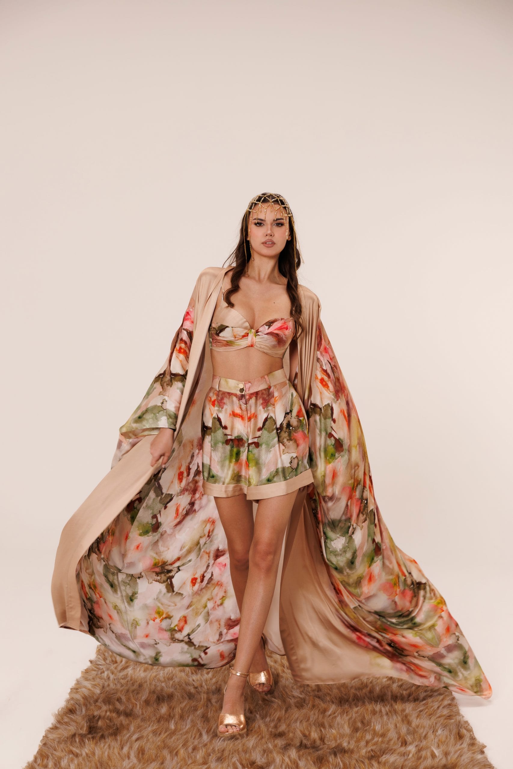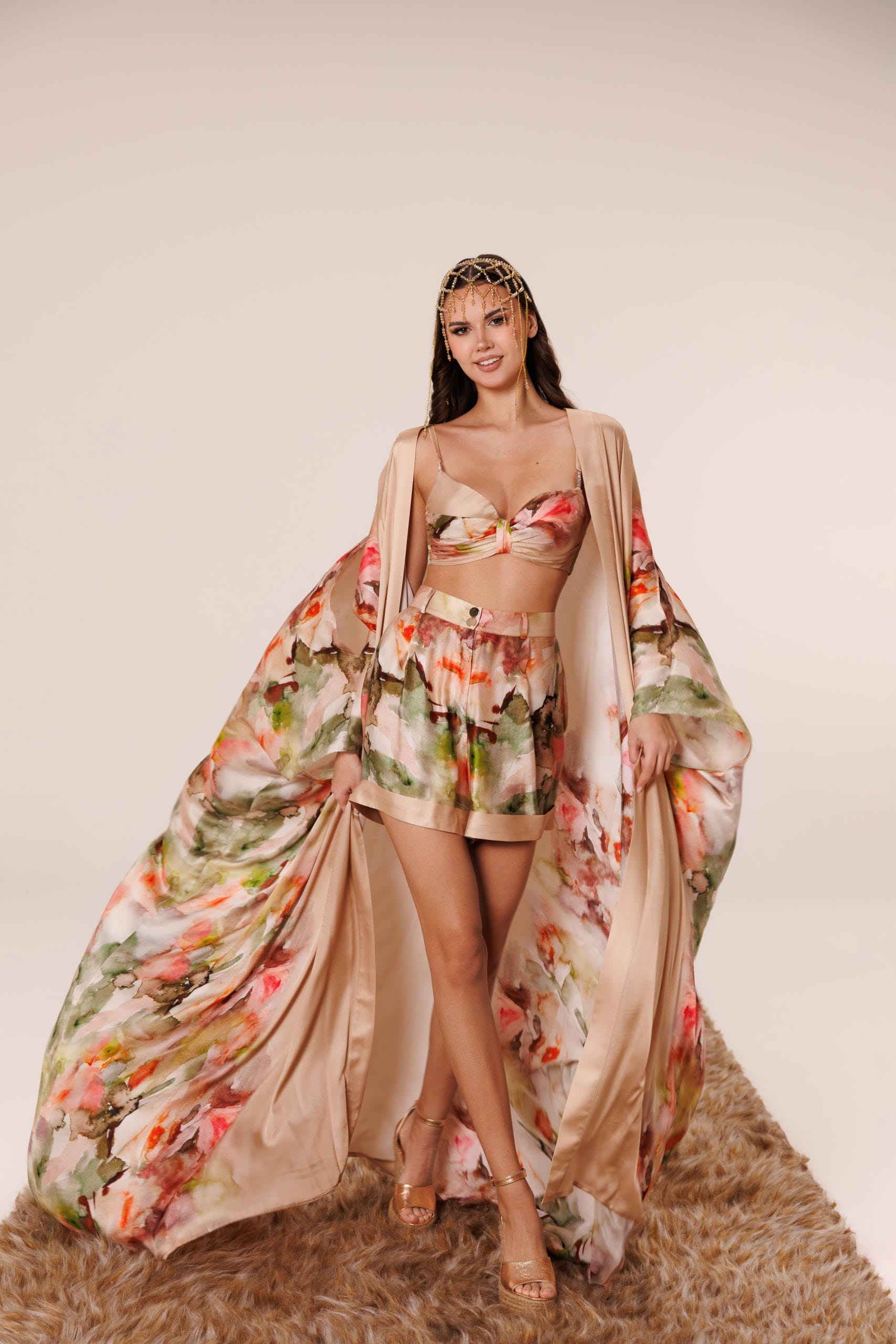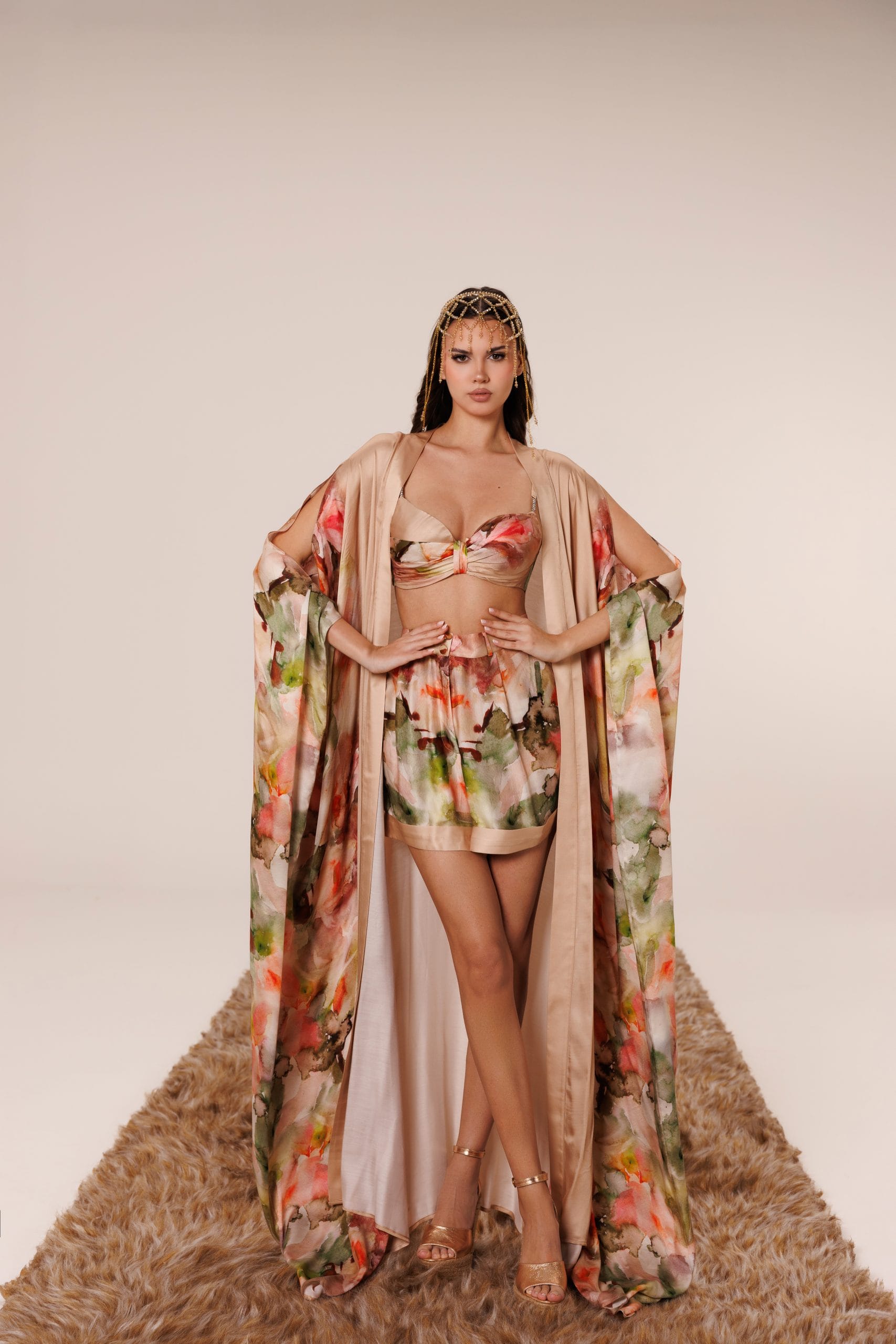 Golden Alhambra %100 saf Mulberry ipek kimono takım ile lüks resort stilini keşfedin. Bustiyer, şort ve akışkan kimono formuyla sofistike şıklık sunar.