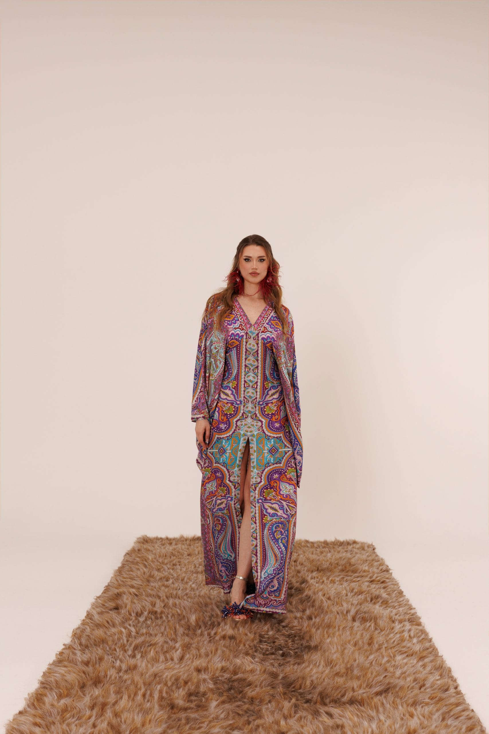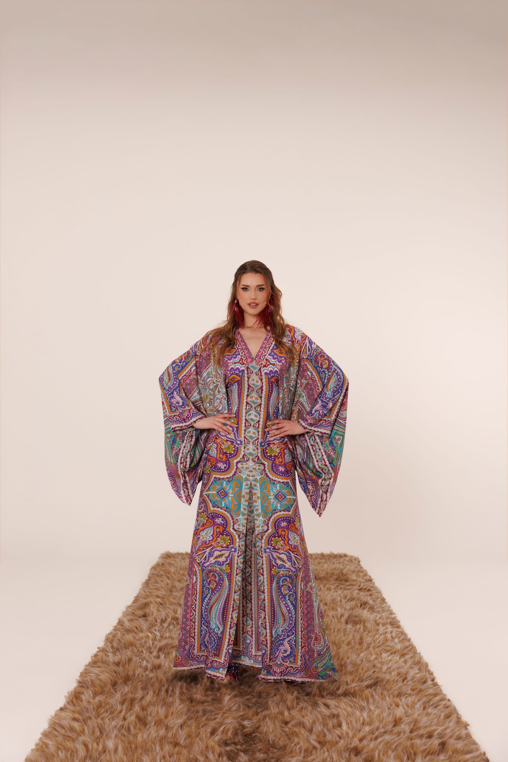 Royal Alhambra %100 saf ipek kaftan elbise, zengin desenleri ve akışkan yapısıyla lüks ve etkileyici bir stil sunar.