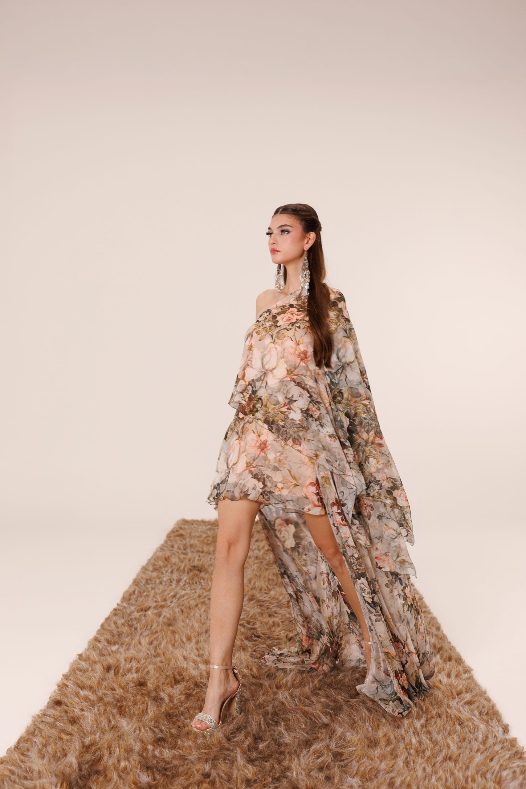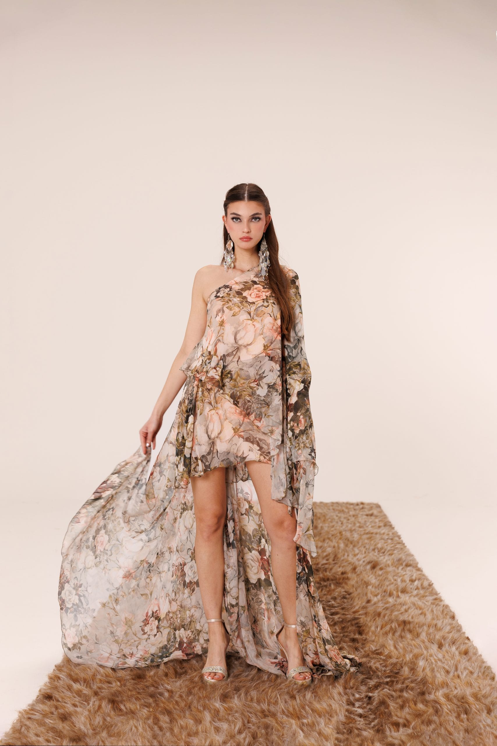 %100 saf ipek şifonun neredeyse ağırlıksız dokusu, her adımda havayla birlikte hareket eder. Çiçek desenlerinin yumuşak geçişleri, tasarıma romantik ama güçlü bir karakter kazandırır.
