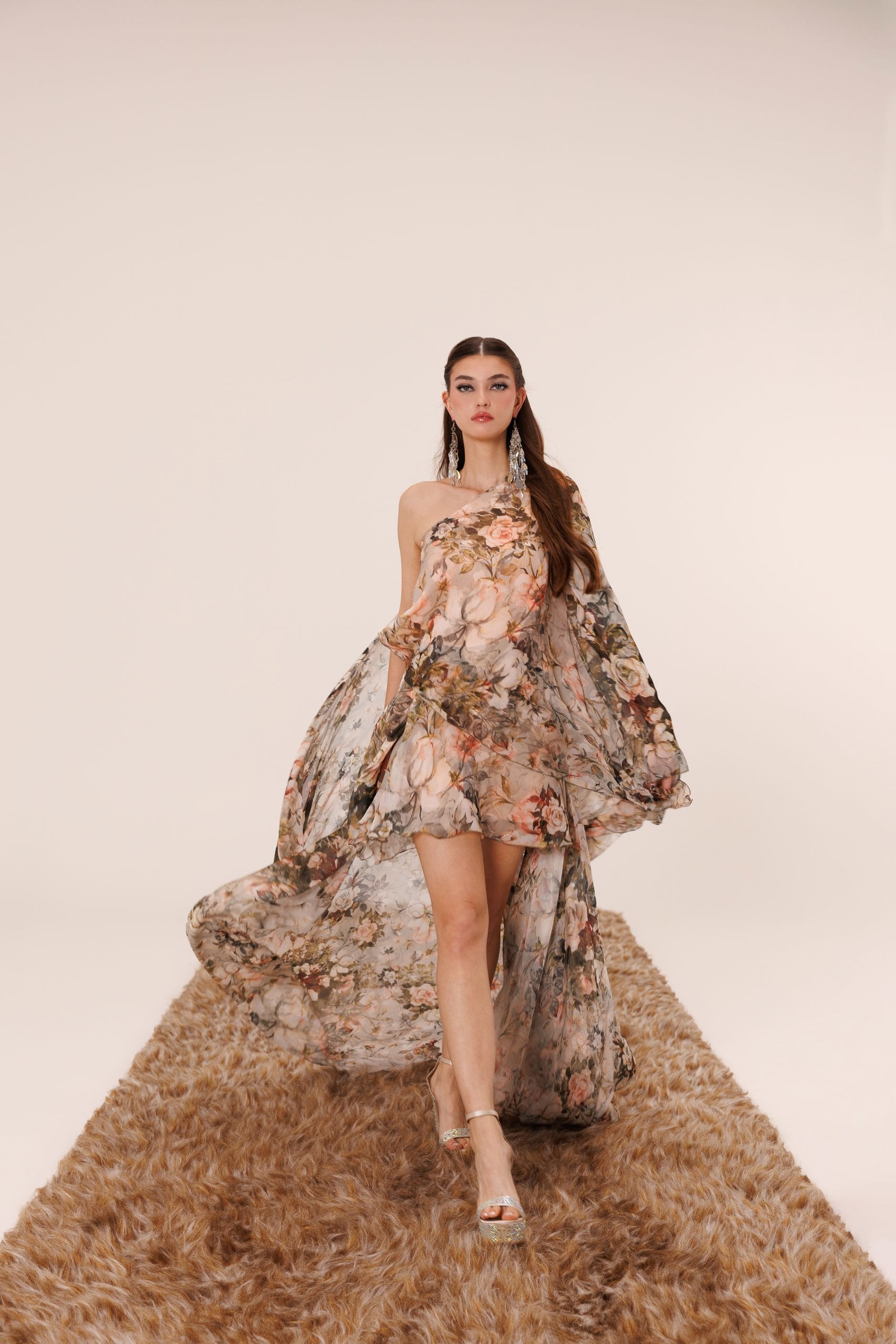 Asimetrik tek omuz kesimi ve arkaya doğru uzayan akışkan formu, klasik silüeti modern bir couture ifadesine dönüştürür. Her hareket, bir iz bırakır. Her dönüş, bir hikâye anlatır.