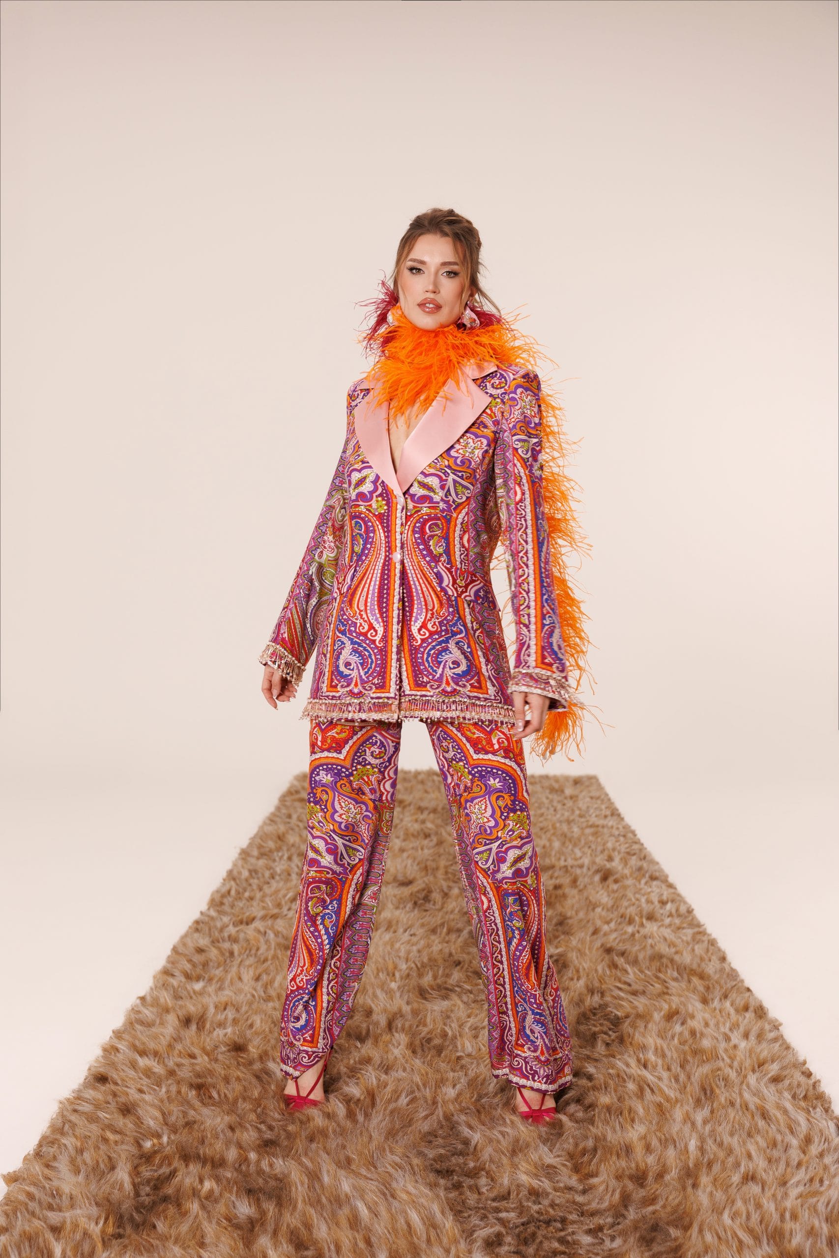 Zengin desen kompozisyonu, sanat ve modanın kesiştiği noktada sofistike bir ifade yaratır.