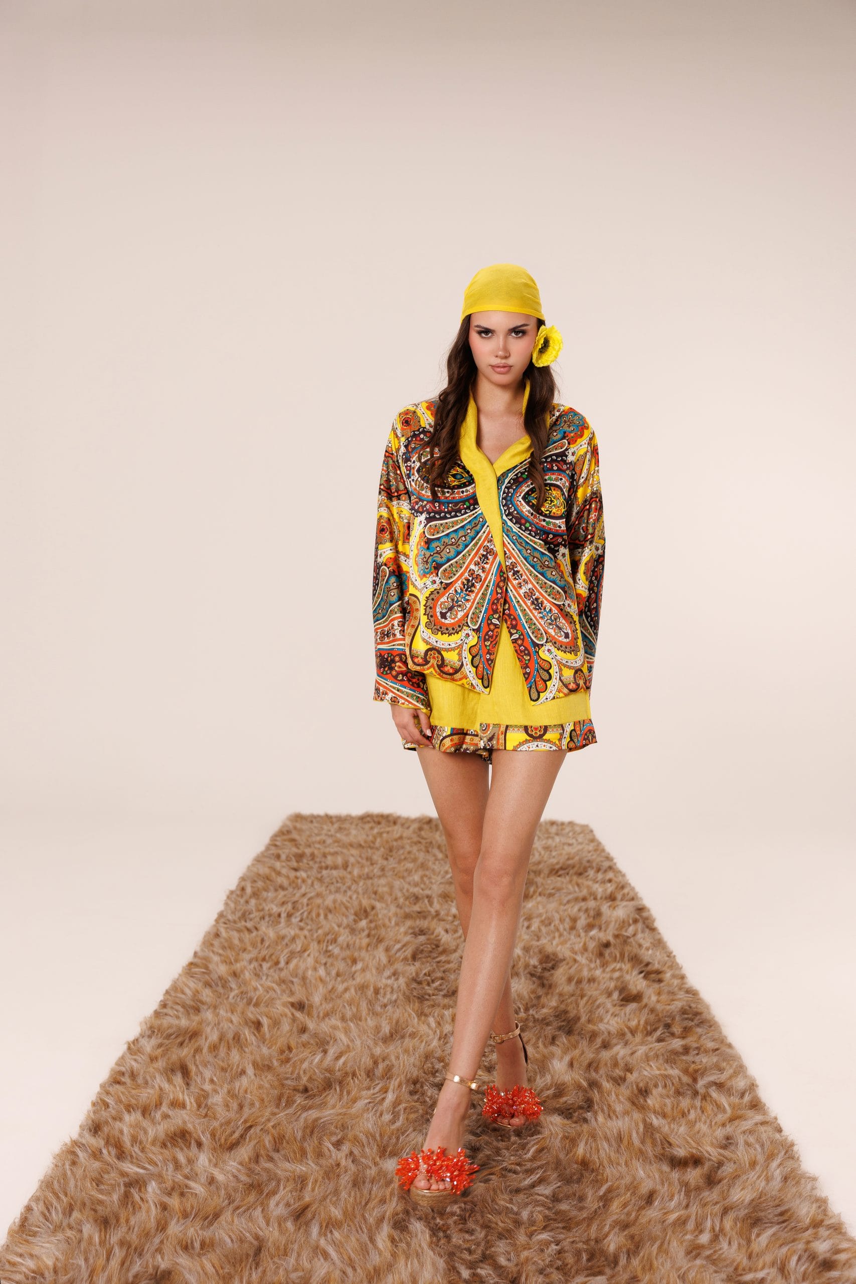 Canlı sarı tonları ve zengin etnik desenler, tasarıma güçlü ve dikkat çekici bir karakter kazandırırken; hafif ve nefes alan yapı, gün boyu konfor sağlar.