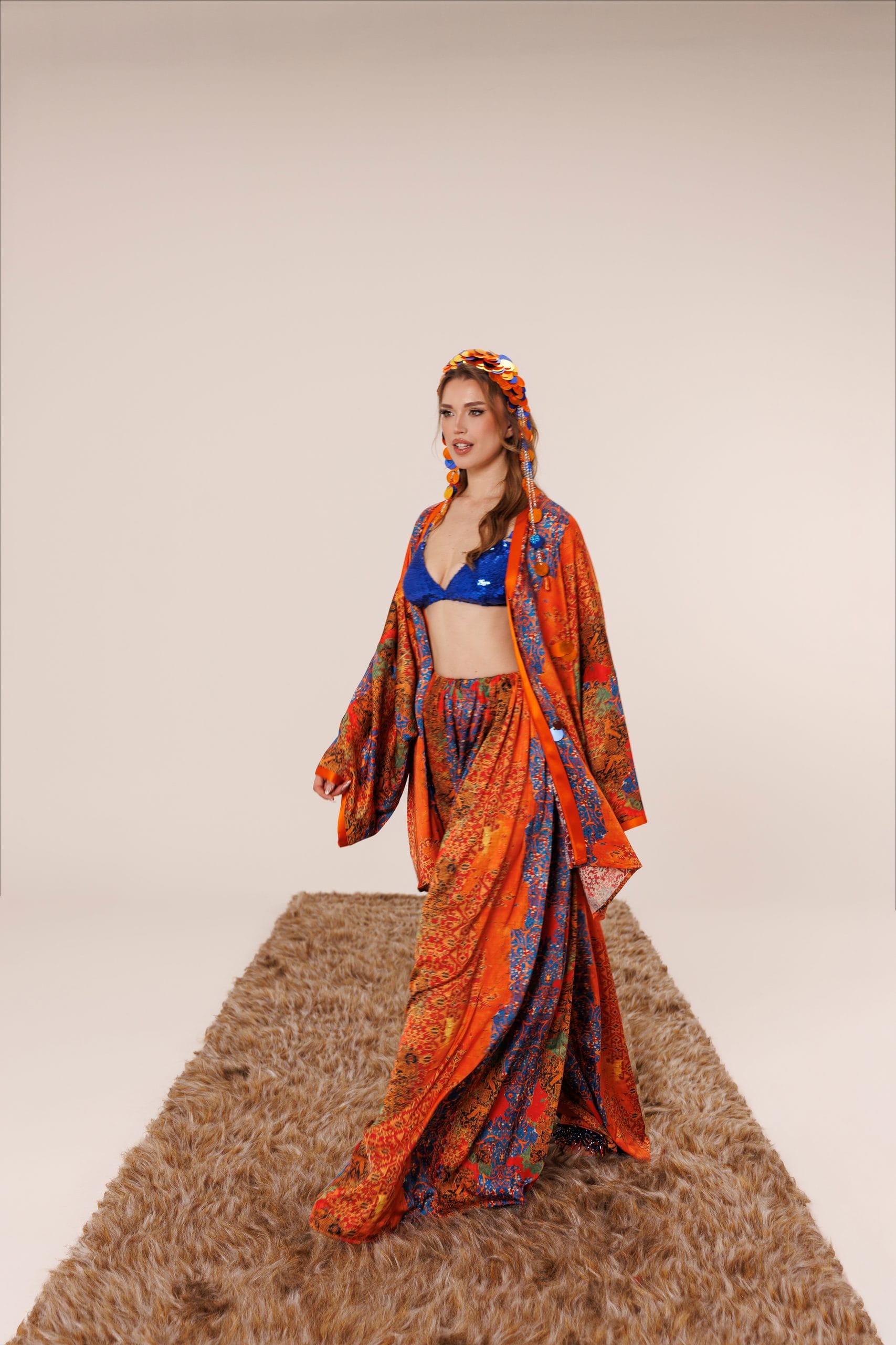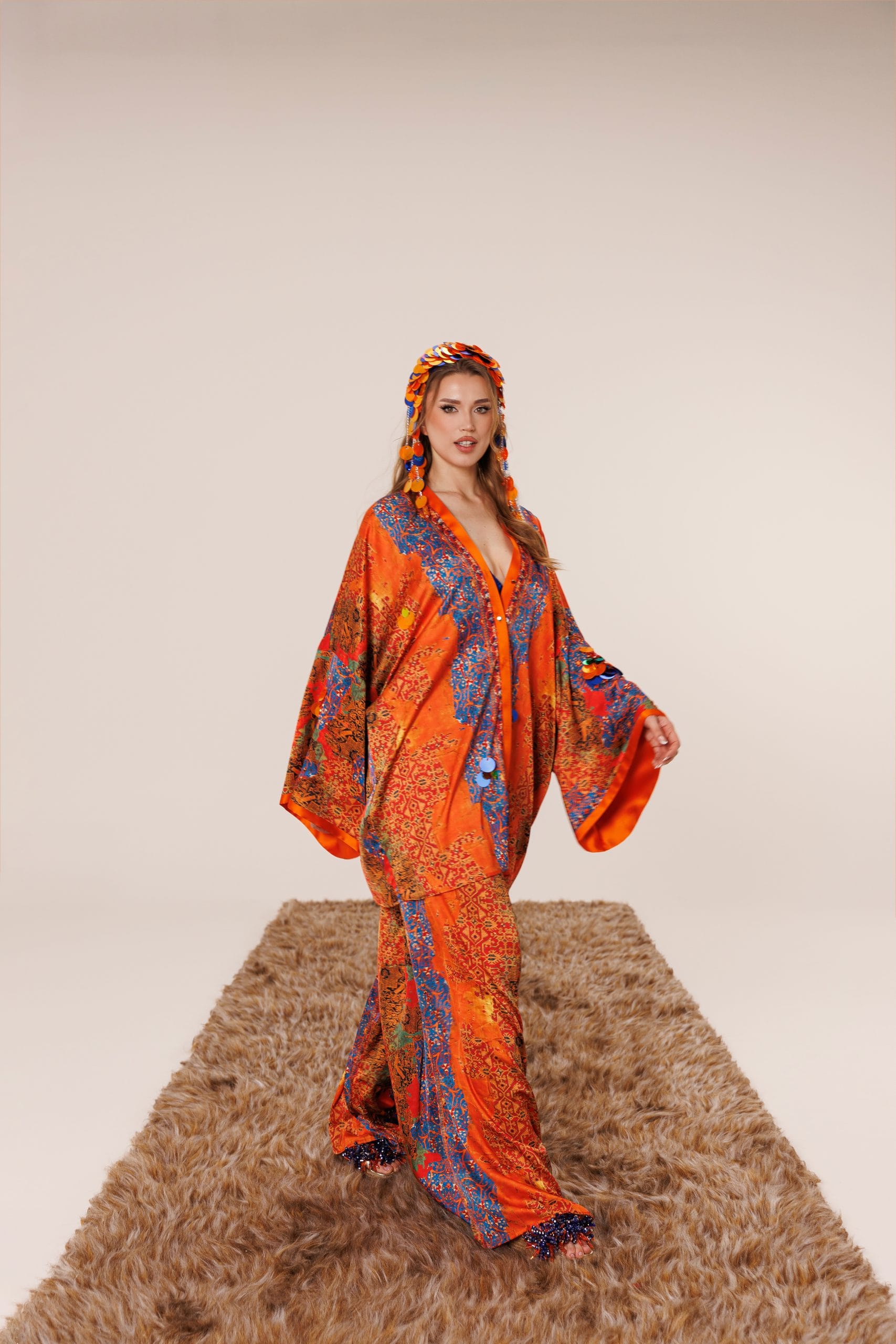 Sunset in Granada İpek Karışımlı Kimono Pantolon Takım | Japanese Silk Blend Luxury Resort Set | Soul of Leila